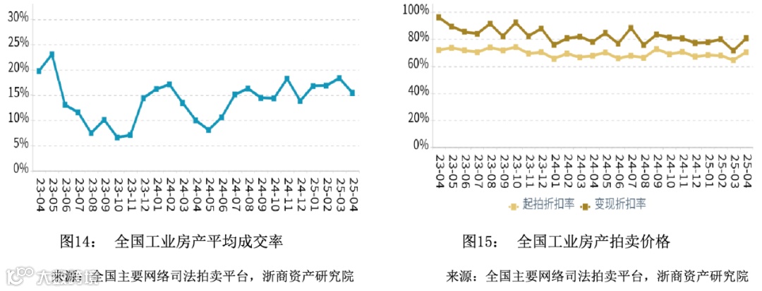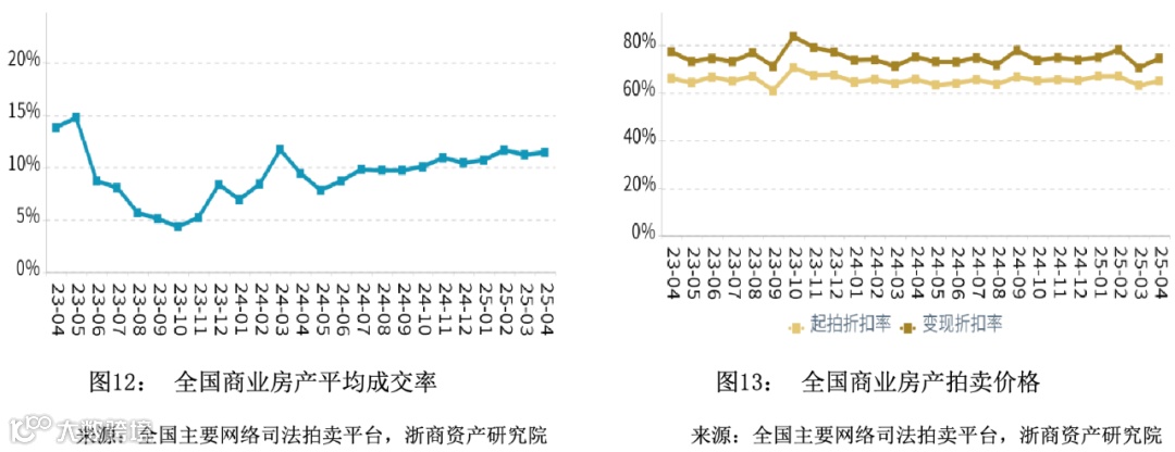 在成交率方面,2025年4月全国商业平均成交率微幅上升,平均水平高于同期。在拍卖价格方面,2025年4月全国商业平均变现折扣率微幅上升,平均水平低于同期。变现价相对于起拍价的溢价幅度相比于同期有所扩大。
