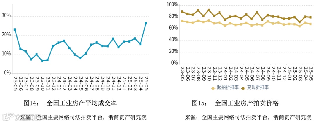 在成交率方面,2025年5月全国工业平均成交率小幅上升,平均水平高于同期。在拍卖价格方面,2025年5月全国工业平均变现折扣率微幅下降,平均水平低于同期。变现价相对于起拍价的溢价幅度相比于同期有所收窄。
