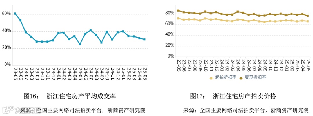 在成交率方面,2025年5月浙江住宅平均成交率微幅下降,平均水平高于同期。金华市成交率领先,湖州市成交率最低。在拍卖价格方面,2025年5月浙江住宅平均变现折扣率微幅下降,平均水平低于同期。变现价相对于起拍价的溢价幅度相比于同期有所收窄;绍兴市变现与起拍价倒挂。