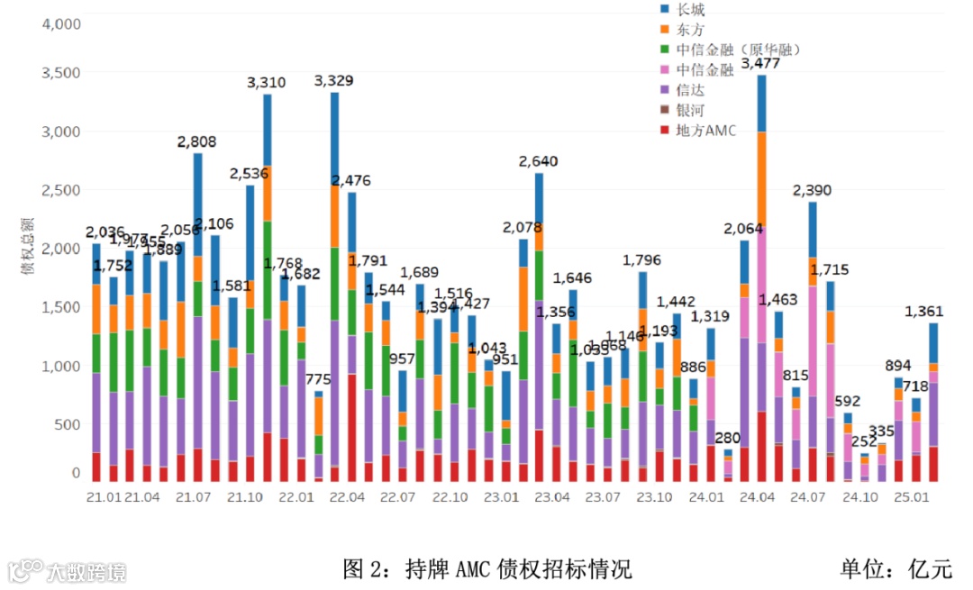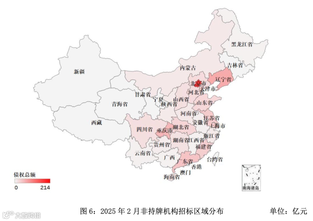 从持牌AMC招标市场的区域分布情况来看,AMC招标规模主要集中在华北、华东和西南地区。2025年2月AMC招标规模最大的是华北地区,约为520亿元,华东地区规模约218亿元,西南地区规模约209亿元。