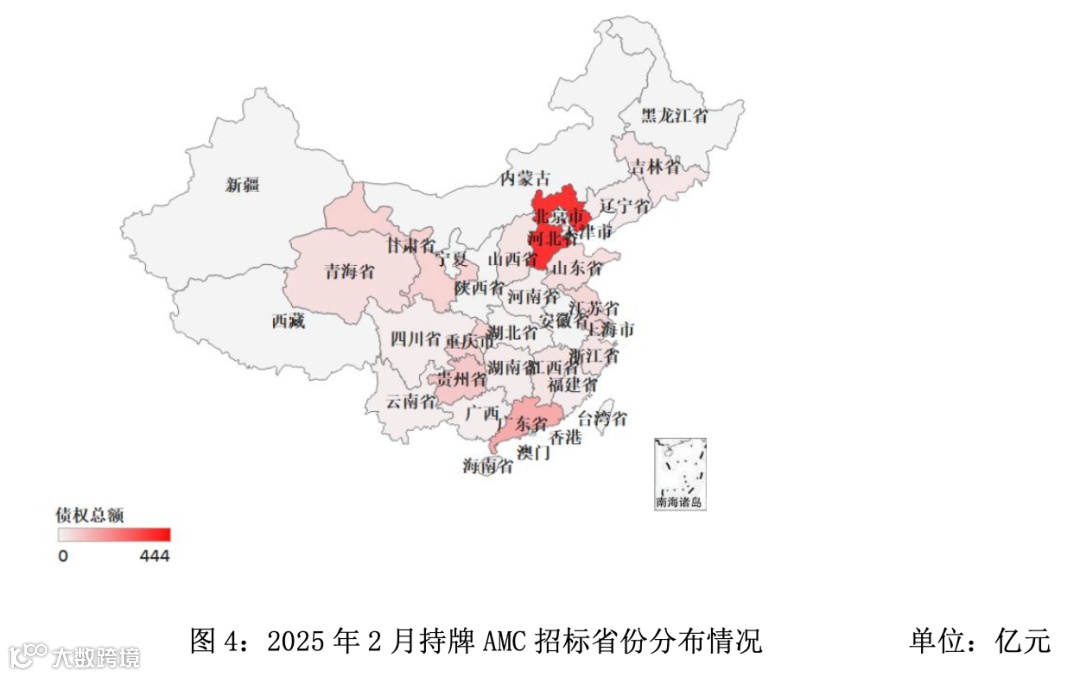 从持牌AMC招标的省份分布来看,2025年2月河北省AMC招标规模最大,约为444亿元,广东省AMC招标规模约为173亿元,贵州省AMC招标规模约为102亿元。