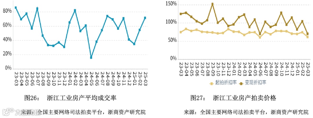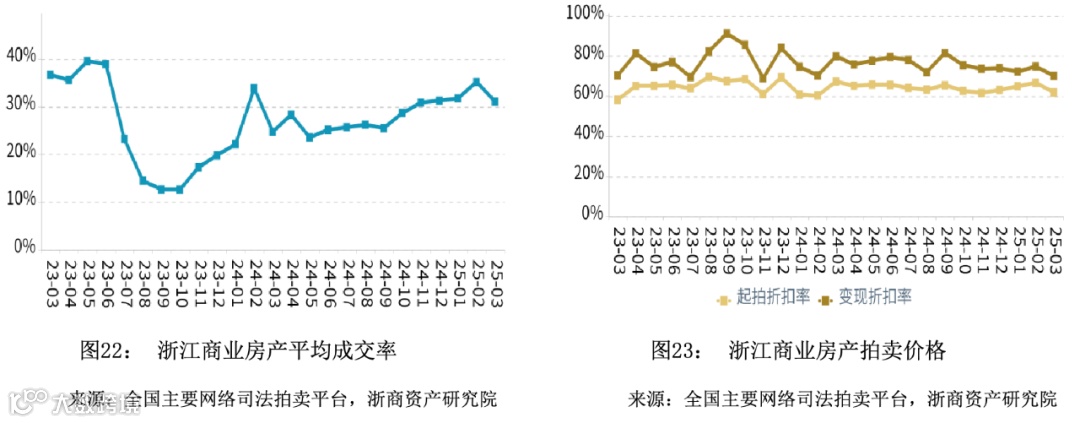 在成交率方面,2025年第一季度浙江商业平均成交率微幅上升,平均水平高于同期。温州市成交率领先,衢州市成交率最低。在拍卖价格方面,2025年第一季度浙江商业平均变现折扣率微幅下降,平均水平低于同期。变现价相对于起拍价的溢价幅度相比于同期有所收窄。