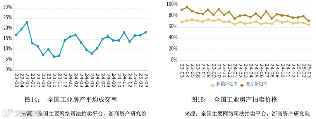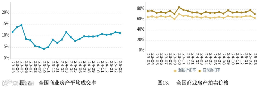 在成交率方面,2025年第一季度全国商业平均成交率微幅上升,平均水平高于同期。在拍卖价格方面,2025年第一季度全国商业平均变现折扣率微幅上升,平均水平高于同期。变现价相对于起拍价的溢价幅度相比于同期有所扩大。