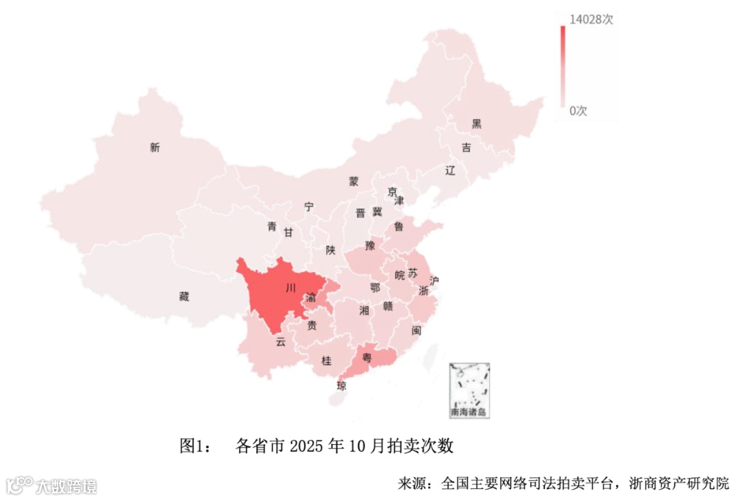 2025年10月全国司法拍卖房产共计106353次,同比下降11.28%。区域上,以四川省为首的黄河以南的省市司法拍卖市场较为活跃,前三位分别是四川省、重庆市、广东省。