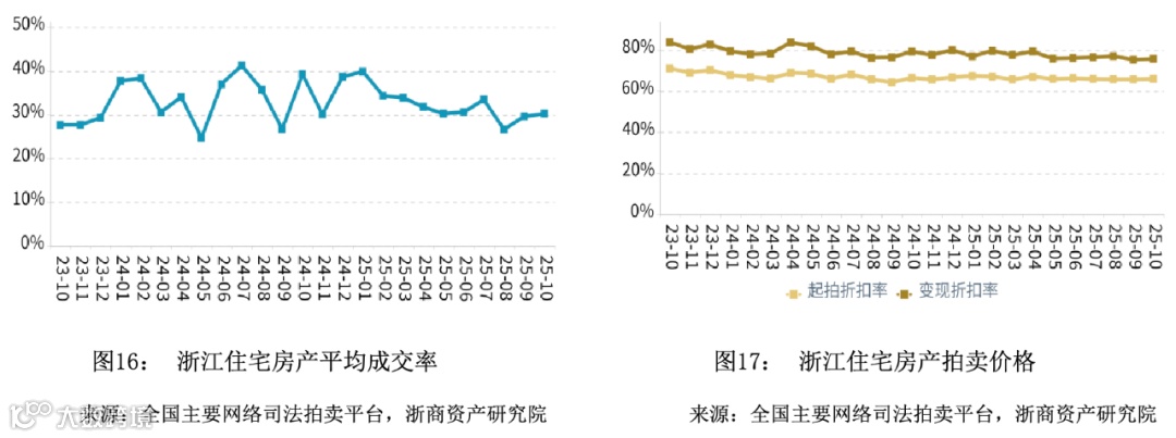 在成交率方面,2025年10月浙江住宅平均成交率环比微幅上升,平均水平低于同期。温州市成交率领先,湖州市成交率最低。在拍卖价格方面,2025年10月浙江住宅平均变现折扣率环比微幅上升,平均水平低于同期。变现价相对于起拍价的溢价幅度相比于同期有所收窄。