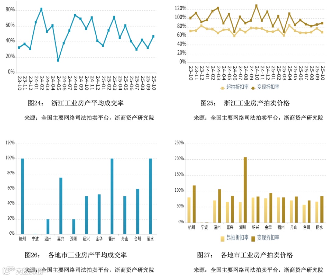 在成交率方面,2025年10月浙江工业平均成交率环比大幅上升,平均水平低于同期。杭州市成交率领先,宁波市没有成交记录。在拍卖价格方面,2025年10月浙江工业平均变现折扣率环比小幅上升,平均水平低于同期。变现价相对于起拍价的溢价幅度相比于同期有所收窄。