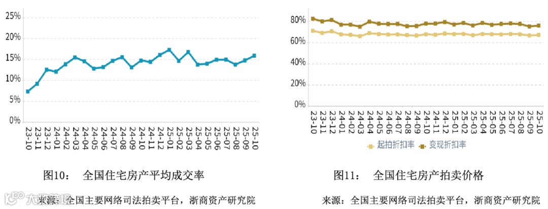 2025年10月全国住宅平均成交率环比微幅上升,平均水平高于同期。在拍卖价格方面,2025年10月全国住宅平均变现折扣率环比微幅上升,平均水平低于同期。变现价相对于起拍价的溢价幅度相比于同期有所收窄。