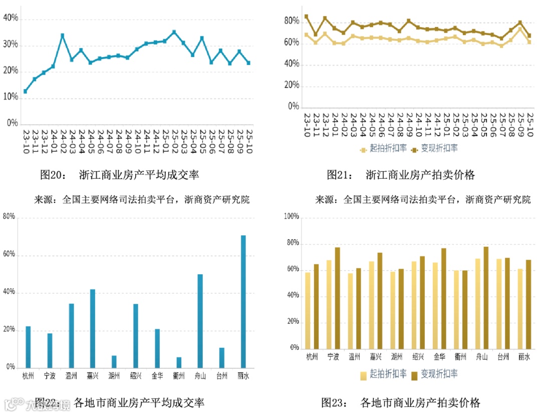 在成交率方面,2025年10月浙江商业平均成交率环比小幅下降,平均水平低于同期。丽水市成交率领先,衢州市成交率最低。在拍卖价格方面,2025年10月浙江商业平均变现折扣率环比大幅下降,平均水平低于同期。变现价相对于起拍价的溢价幅度相比于同期有所收窄。