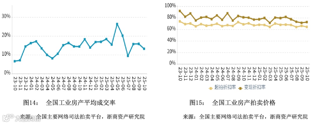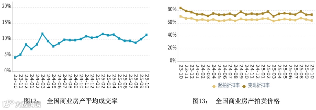 在成交率方面,2025年10月全国商业平均成交率环比微幅上升,平均水平高于同期。在拍卖价格方面,2025年10月全国商业平均变现折扣率环比微幅上升,平均水平低于同期。变现价相对于起拍价的溢价幅度相比于同期有所扩大。
