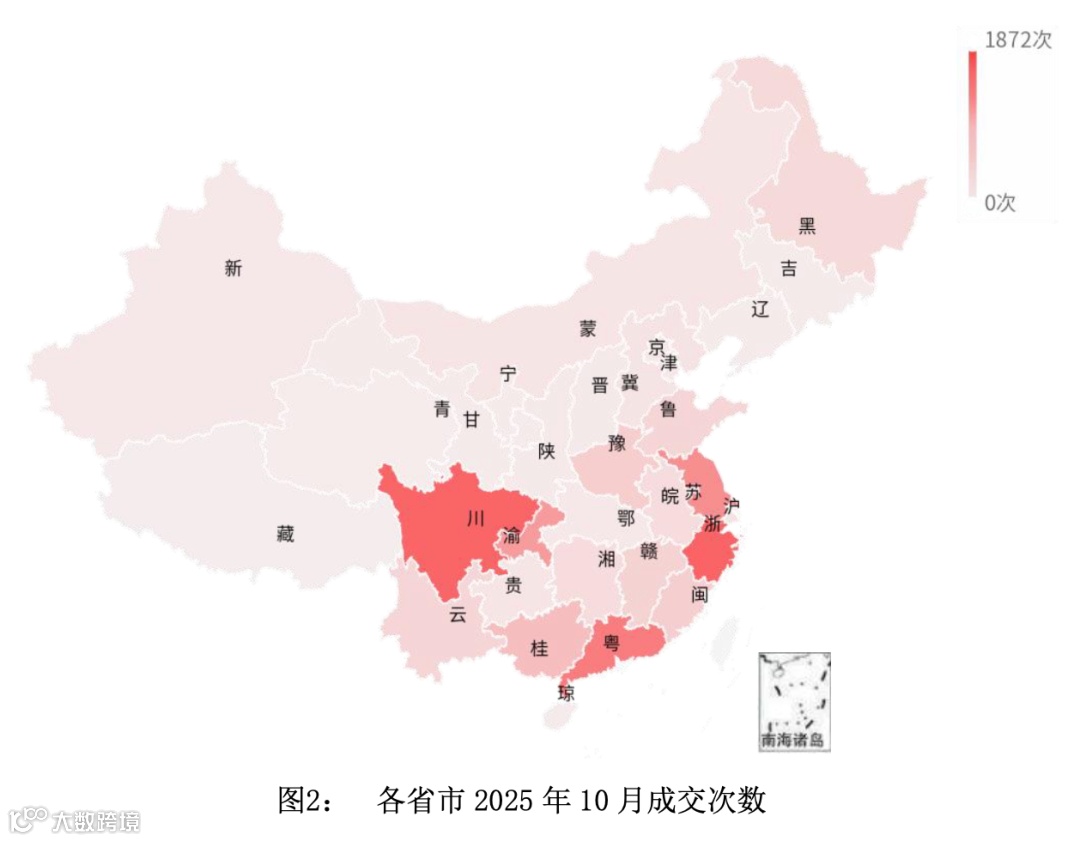 2025年10月全国司法拍卖房产成交共计15642次,同比下降2.28%。区域上,以浙江、四川省为首的黄河以南的省市司法拍卖市场较为活跃,前三位分别是浙江省、四川省、广东省。