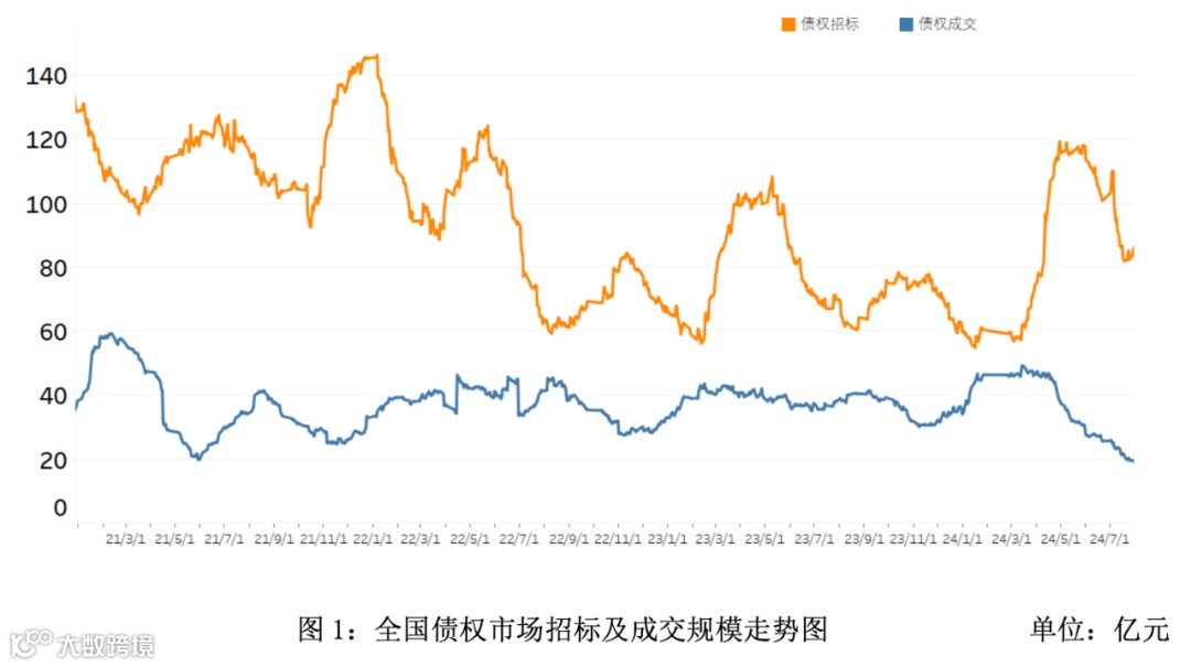 1、从债权市场的整体情况来看,2024年7月持牌机构招标规模约为2347亿元,同比上升116.9%,非持牌机构招标规模约为355亿元,同比上升362.6%;银行成交规模约为196亿元,同比下降54.9%,AMC成交规模约为141亿元,同比下降58.4%,非持牌机构成交规模约为99亿元,同比下降62.9%。2024年7月金融不良债权市场招标规模快速上升,整体高于2023年7月;债权市场成交规模不景气,整体规模低于去年同期。