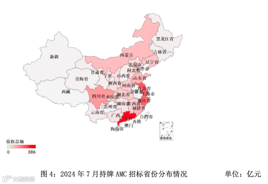 从持牌AMC招标的省份分布来看,2024年7月广东省AMC招标规模最大,约为386亿元,江苏省AMC招标规模约为288亿元,浙江省AMC招标规模约为271亿元。