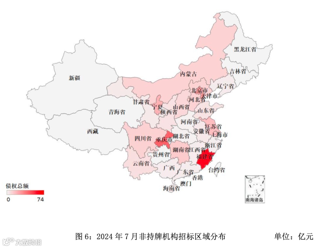 从2024年7月的债权市场招标情况来看,持牌机构与非持牌机构的招标规模同比、环比均上升。从招标的整体格局来看,广东省、江苏省、浙江省等省份的AMC债权招标最活跃。