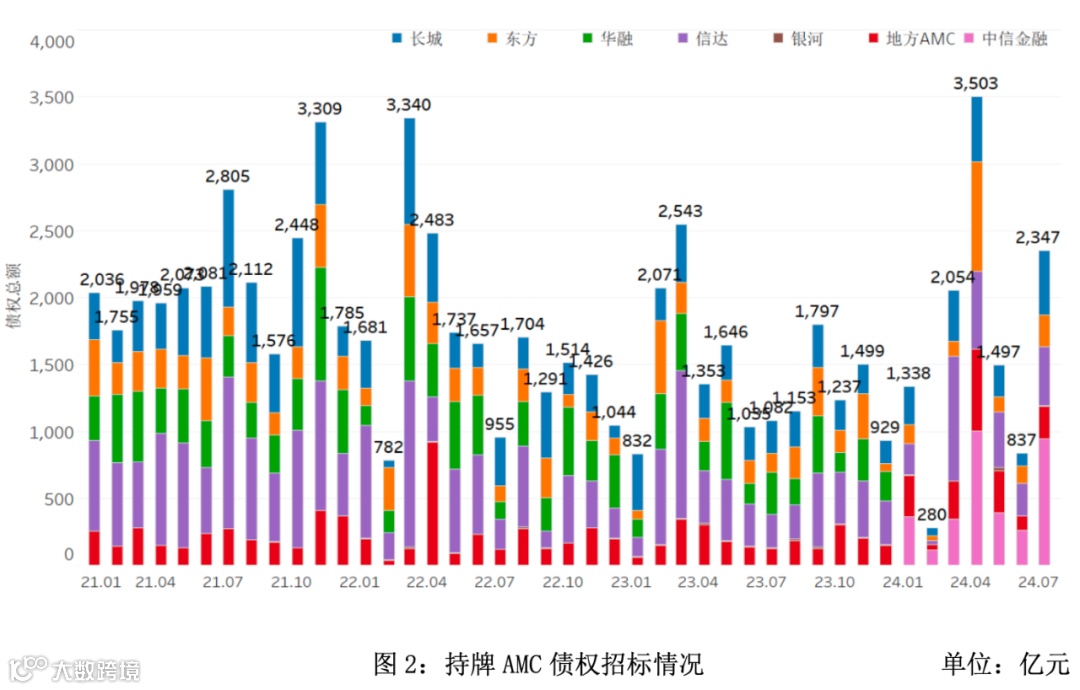 从持牌AMC招标市场的区域分布情况来看,AMC招标规模主要集中在华东和华南地区。2024年7月AMC招标规模最大的是华东地区,约为892亿元,华南地区规模约为420亿元。
