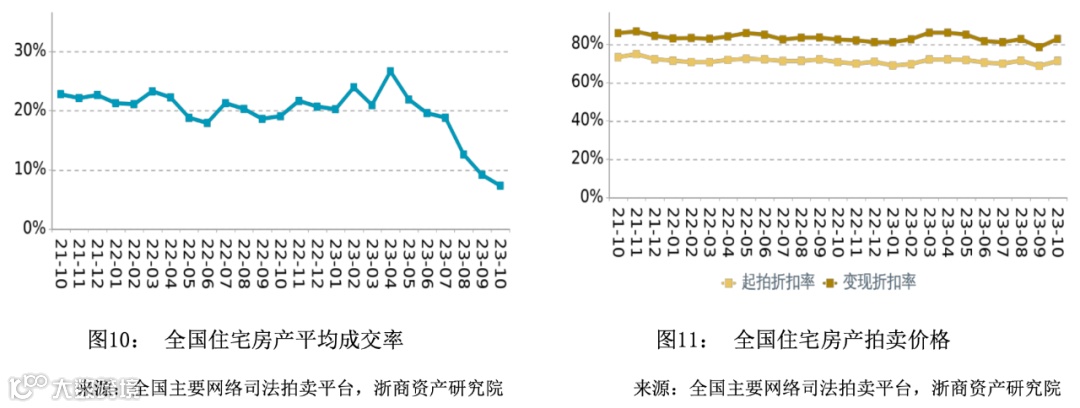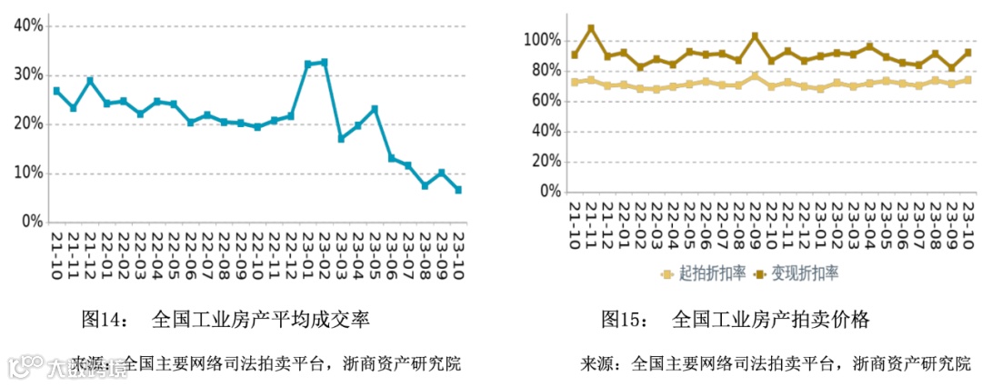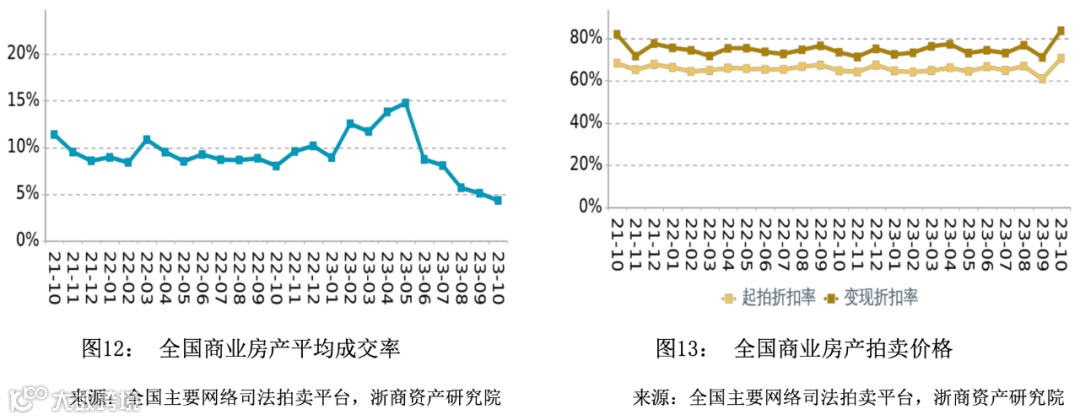 在成交率方面,2023年10月全国商业平均成交率微幅下降,平均水平低于同期。在拍卖价格方面,2023年10月全国商业平均变现折扣率小幅上升,平均水平高于同期。变现价相对于起拍价的溢价幅度相比于同期有所扩大。