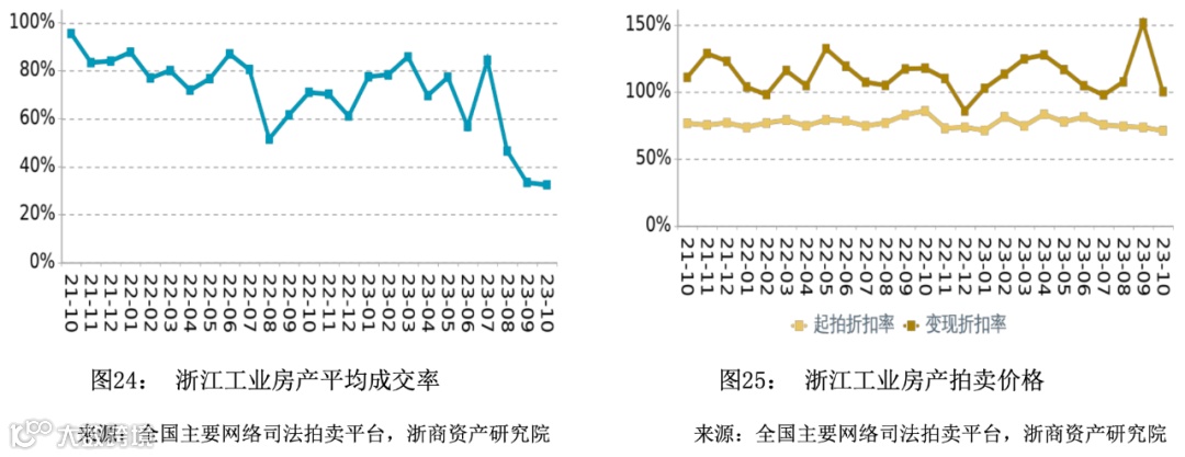 在成交率方面,2023年10月浙江商业平均成交率小幅下降,平均水平低于同期。丽水市成交率领先,衢州市、湖州市没有成交记录。在拍卖价格方面,2023年10月浙江商业平均变现折扣率小幅上升,平均水平高于同期。变现价相对于起拍价的溢价幅度相比于同期有所扩大。