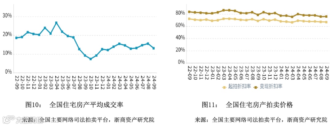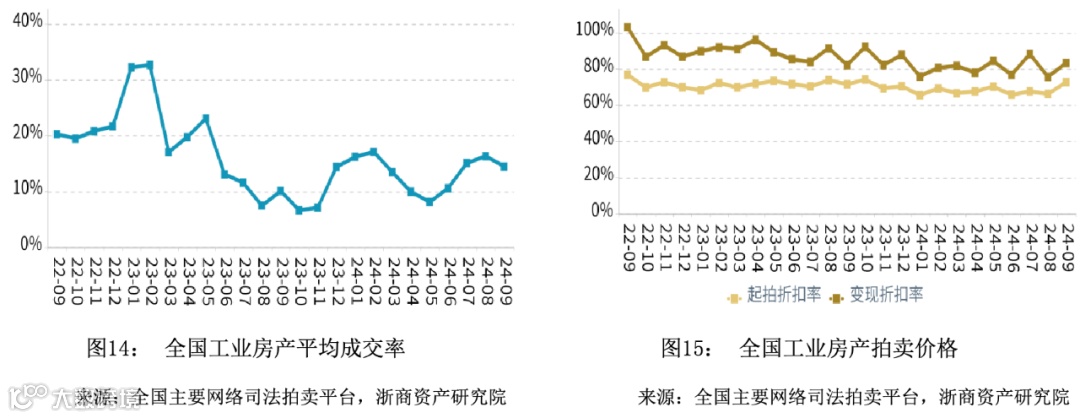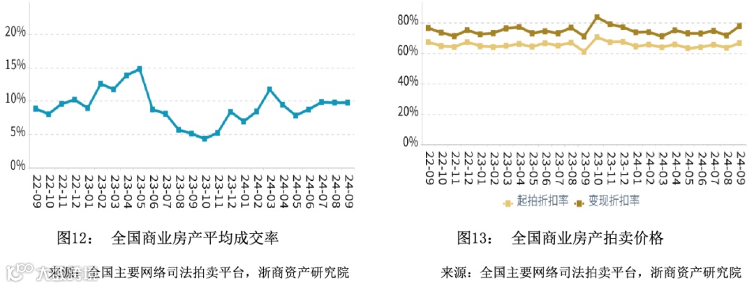 在成交率方面,2024年第三季度全国商业平均成交率同比微幅上升,平均水平高于同期。在拍卖价格方面,2024年第三季度全国商业平均变现折扣率同比微幅上升,平均水平高于同期。变现价相对于起拍价的溢价幅度相比于同期有所扩大。