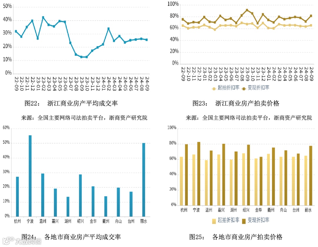 在成交率方面,2024年第三季度浙江商业平均成交率同比微幅上升,平均水平高于同期。宁波市成交率领先,湖州市成交率最低。在拍卖价格方面,2024年第三季度浙江商业平均变现折扣率同比微幅下降,平均水平低于同期。变现价相对于起拍价的溢价幅度相比于同期有所扩大。