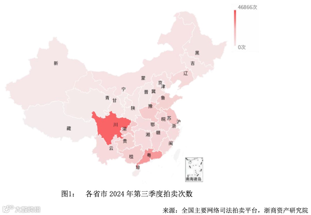 2024年第三季度全国司法拍卖房产共计348460次,同比上升43.71%。区域上,以四川省为首的黄河以南的省市司法拍卖市场较为活跃,前三位分别是四川省、广东省、江苏省。