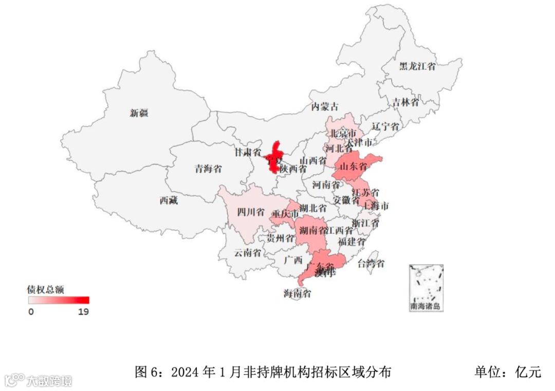 从非持牌机构招标的区域分布情况来看,宁夏非持牌市场招标约为19亿元,占比29.3%;山东省非持牌市场招标约为10亿元,占比15.4%;广东省非持牌市场招标约为10亿元,占比14.9%。