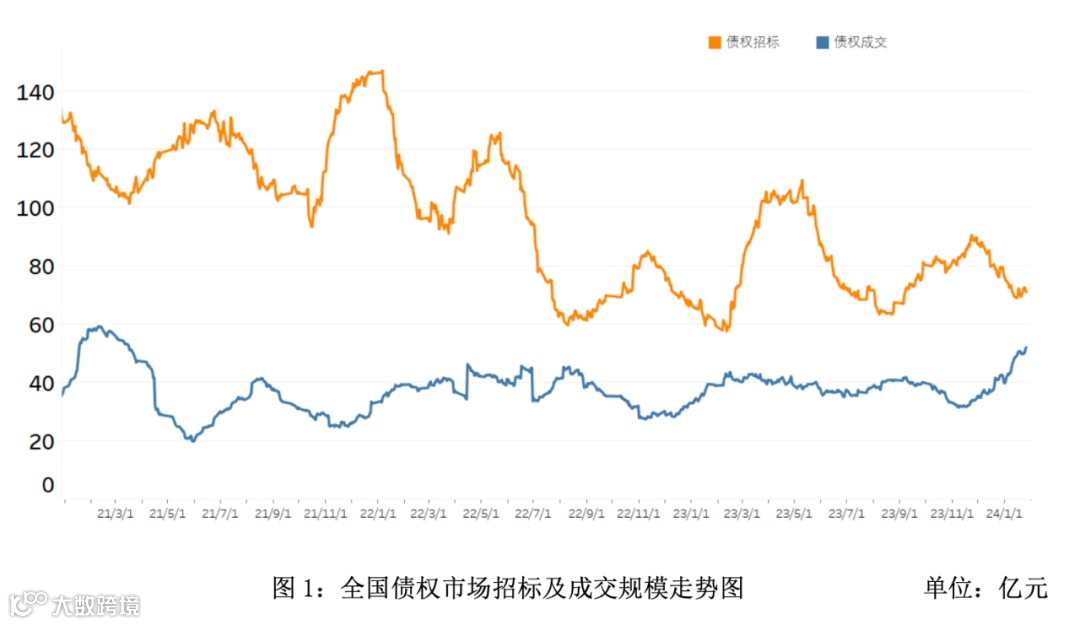 1、从债权市场的整体情况来看,2024年1月持牌机构招标规模约为1,398亿元,同比上升64.1%,非持牌机构招标规模约为65亿元,同比下降59.1%;银行成交规模约为798亿元,同比上升7.5%,AMC成交规模约为435亿元,同比上升46.7%,非持牌机构成交规模约为234亿元,同比上升82.9%。2024年1月金融不良债权市场招标规模持续下降,高于2023年1月;债权成交规模持续上升,整体规模与去年同期相比略有上升。