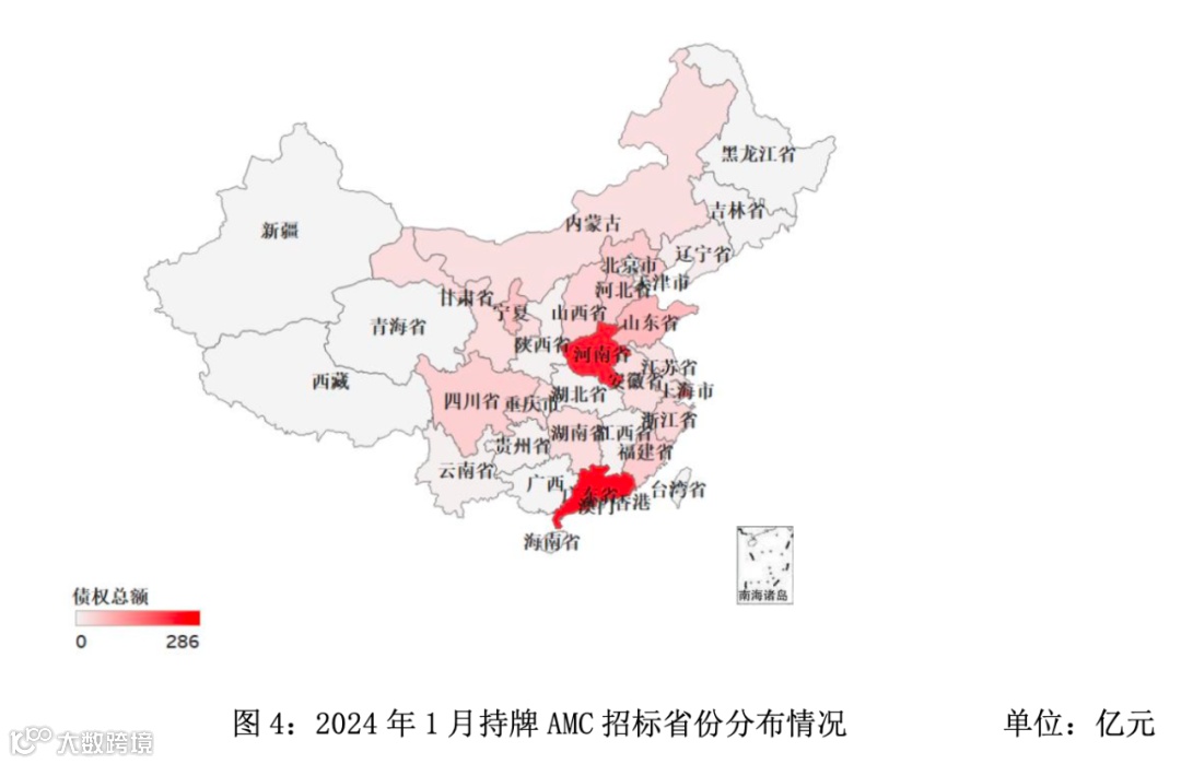 从持牌AMC招标的省份分布来看,广东省2024年1月AMC招标规模最大,约为286亿元,河南省AMC招标规模约为270亿元,上海市AMC招标规模约为193亿元。