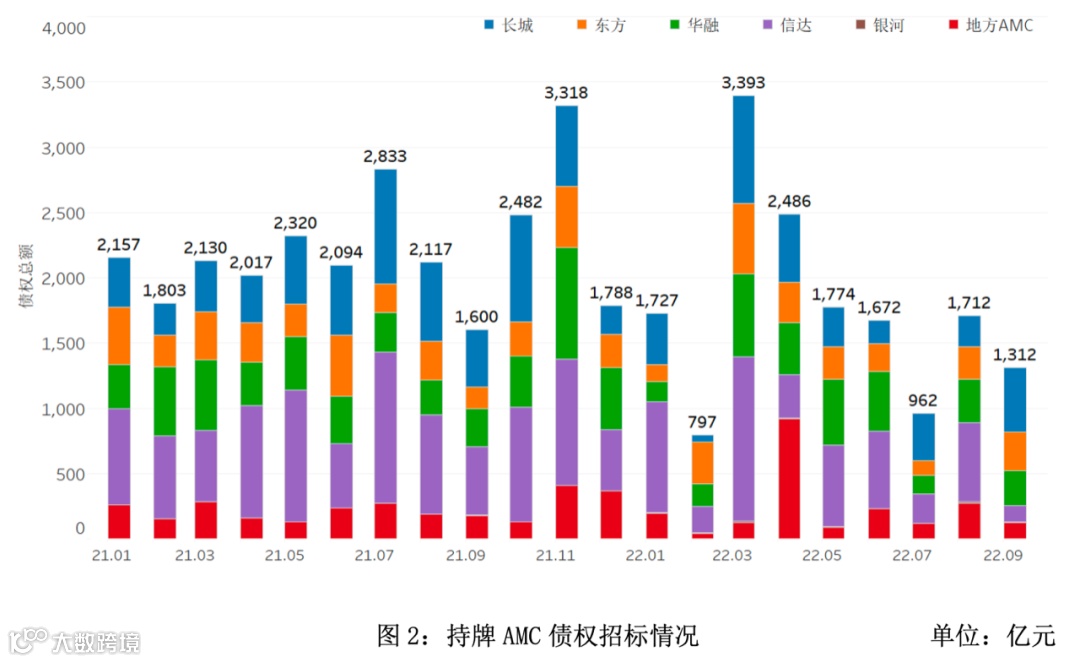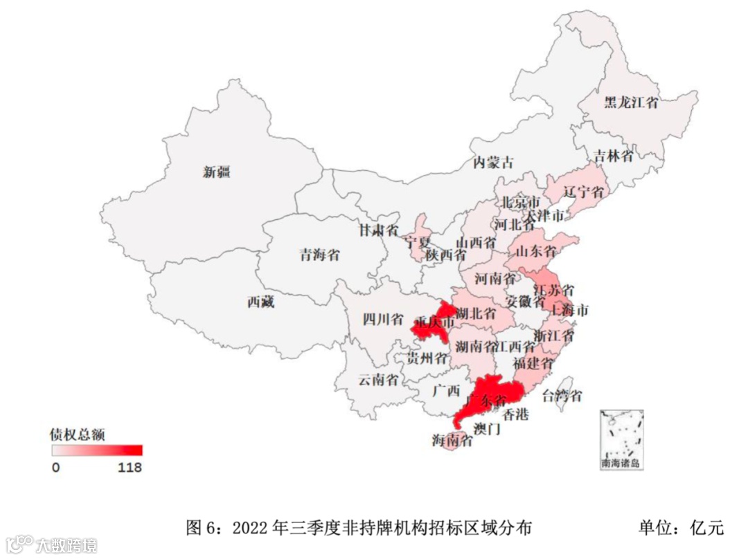 从持牌AMC招标市场的区域分布情况来看,AMC招标规模主要集中在华东和华南地区。2022年三季度AMC招标规模最大的是华东地区,约为1,068亿元,华南地区规模约为703亿元。