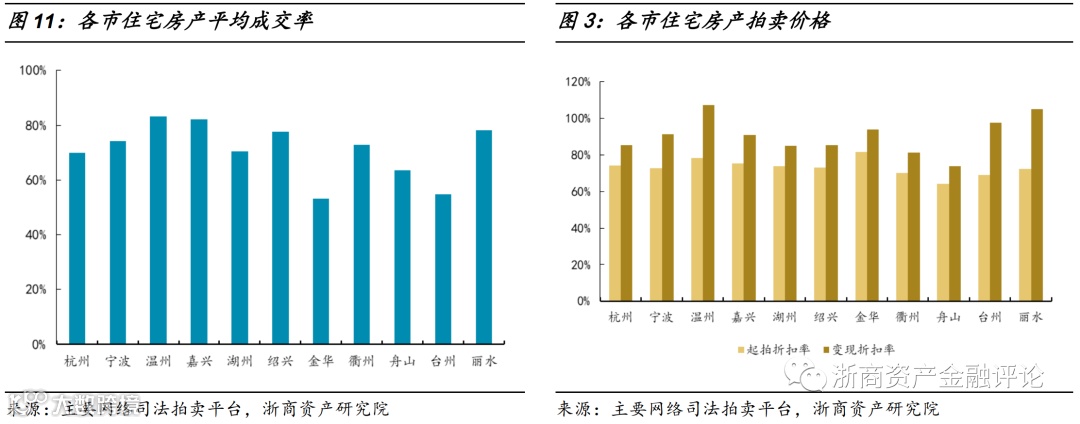 (一)住宅房产:成交率下滑,但变现折扣率连续4个月下降后轻微反弹;各市成交率均大于50%,金华最低,各市的变现与起拍价的价差较大,其中丽水最大