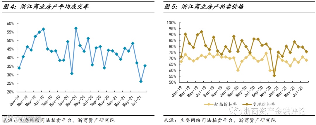 (二)商业房产:成交率低位反弹,变现折扣率延续下滑趋势;丽水成交率摇摇领先,湖州最低;宁波的变现与起拍价的价差较大