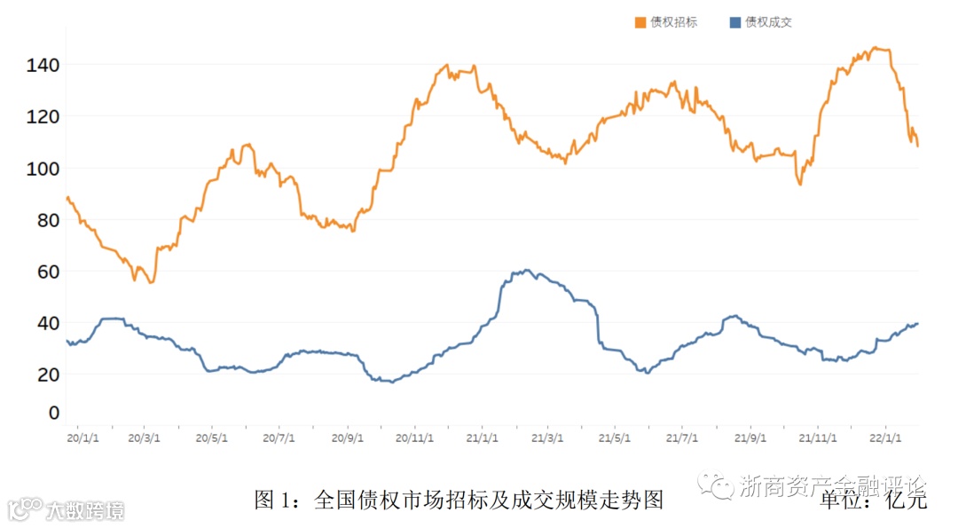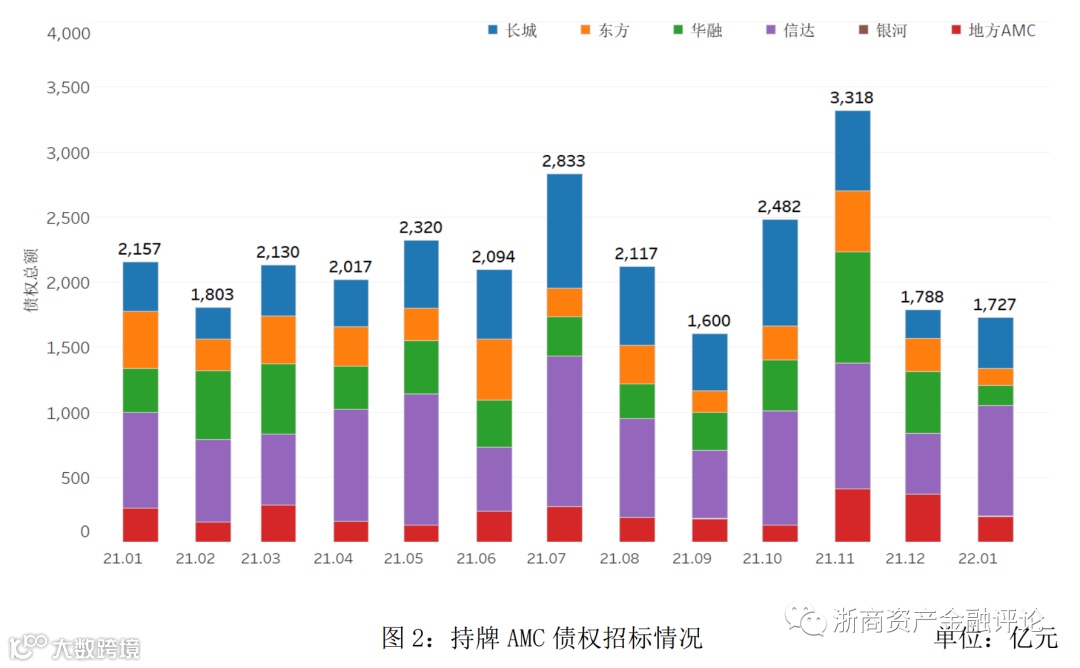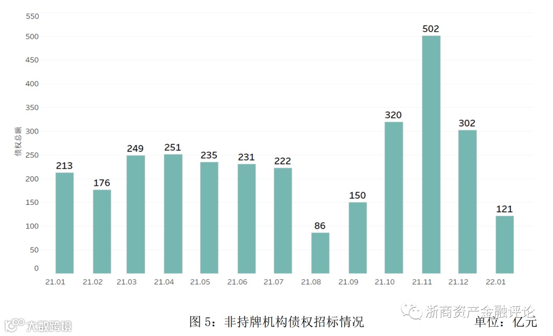 1、从债权市场的整体情况来看,2022年1月持牌机构招标规模约为1,727亿元,同比下降19.9%,非持牌机构招标规模约为121亿元,同比下降43.2%;银行成交规模约为508亿元,同比下降62.6%,AMC成交规模约为368亿元,同比下降18.6%,非持牌机构成交规模约为197亿元,同比上升43.8%。2022年1月债权市场的招标规模开始回落,整体低于2021年1月;成交规模持续上升,但整体规模仍低于去年1月。债权市场流动性较去年1月有所减弱。