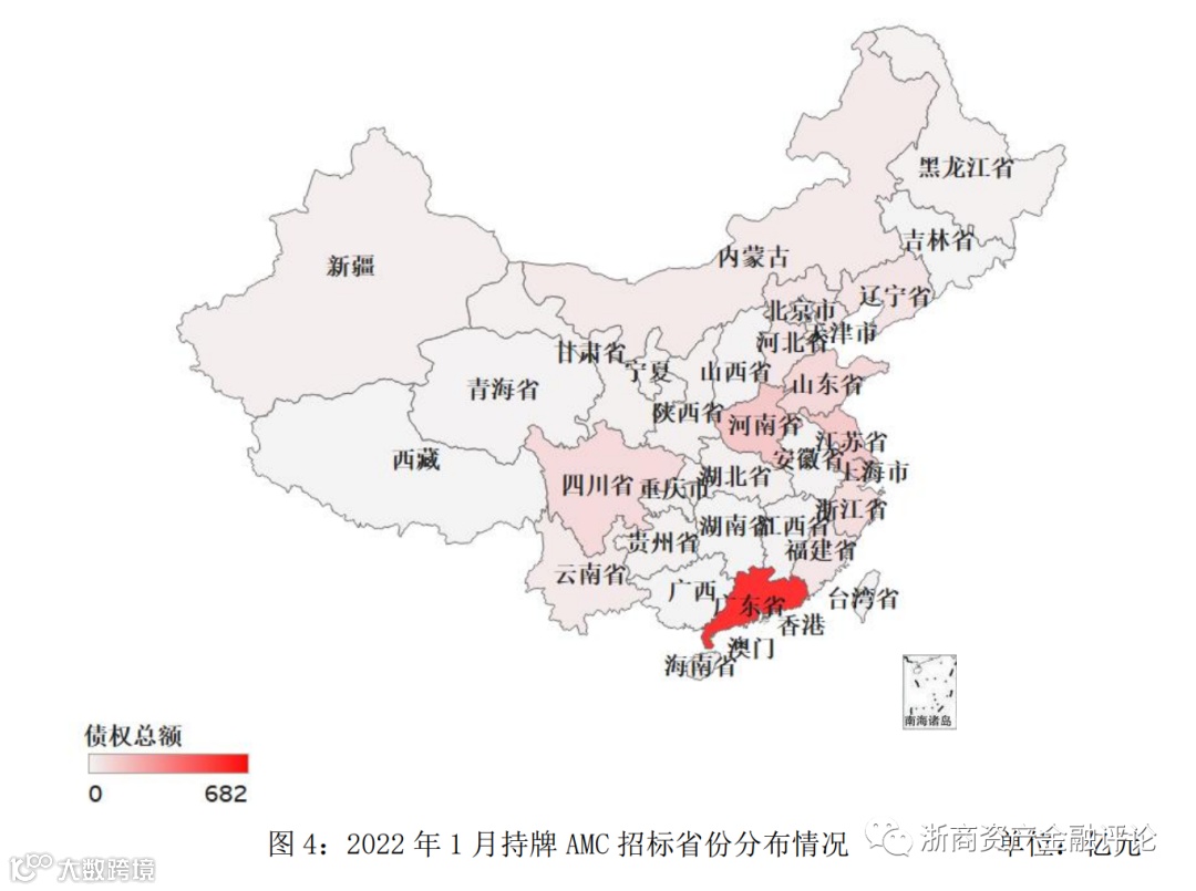 从持牌AMC招标的省份分布来看,2022年1月广东省AMC招标规模最大,约为682亿元,河南省AMC招标规模约为158亿元,江苏省AMC招标规模约为149亿元。