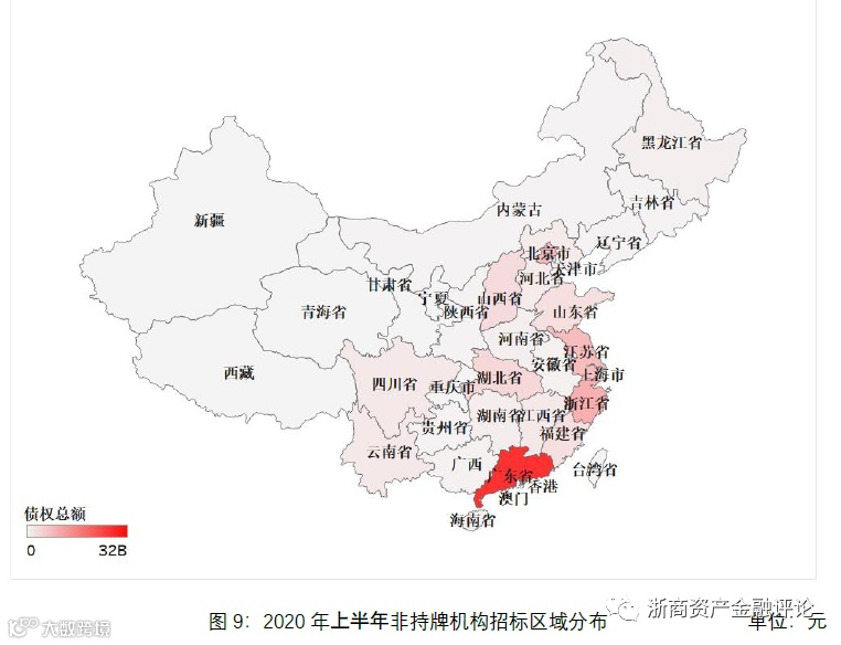 从非持牌机构招标的区域分布情况来看,华南地区较活跃,其中广东省非持牌市场招标约为322亿元,占比33.3%,浙江省非持牌市场招标约为119亿元,占比12.3%;北京市非持牌市场招标约为99亿元,占比10.2%;江苏省非持牌市场招标约为95亿元,占比9.8%。