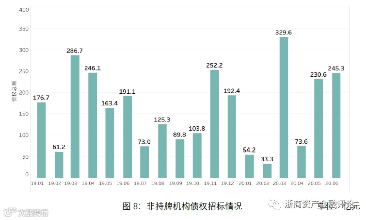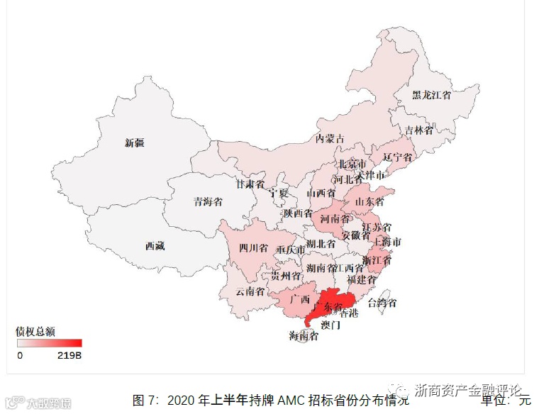 从持牌AMC招标的省份分布来看,2020年上半年广东省AMC招标规模最大,约为2,189亿元,浙江省AMC招标规模约为743亿元,广西AMC招标规模约为657亿元,河南省AMC招标规模约为616亿元,江苏省AMC招标规模约为578亿元。
