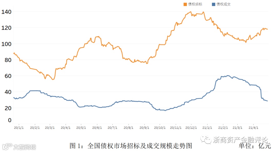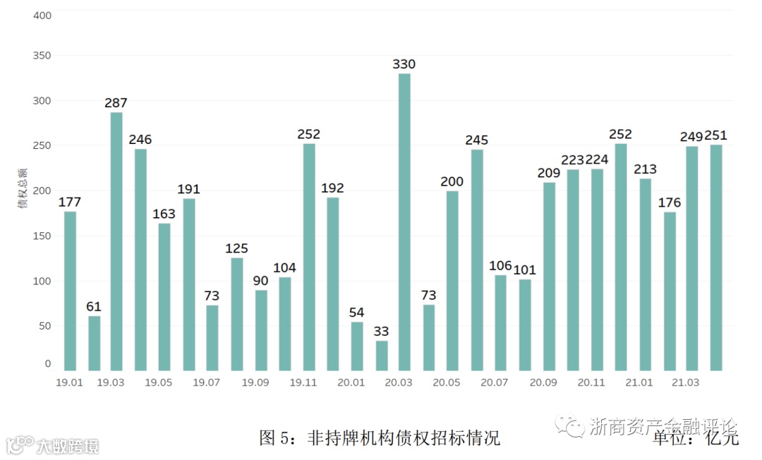 1、从债权市场的整体情况来看,2021年4月持牌机构招标规模约为2,023亿元,同比下降12.5%,非持牌机构招标规模约为251亿元,同比上升243.8%;银行成交规模约为142亿元,同比下降58.7%,AMC成交规模约为135亿元,同比下降7.5%,非持牌机构成交规模约为80亿元,同比上升25.9%。2021年4月债权市场的招标规模回升,成交规模则继续回调,债权市场流动性有所下降,整体规模水平与去年同期相近。