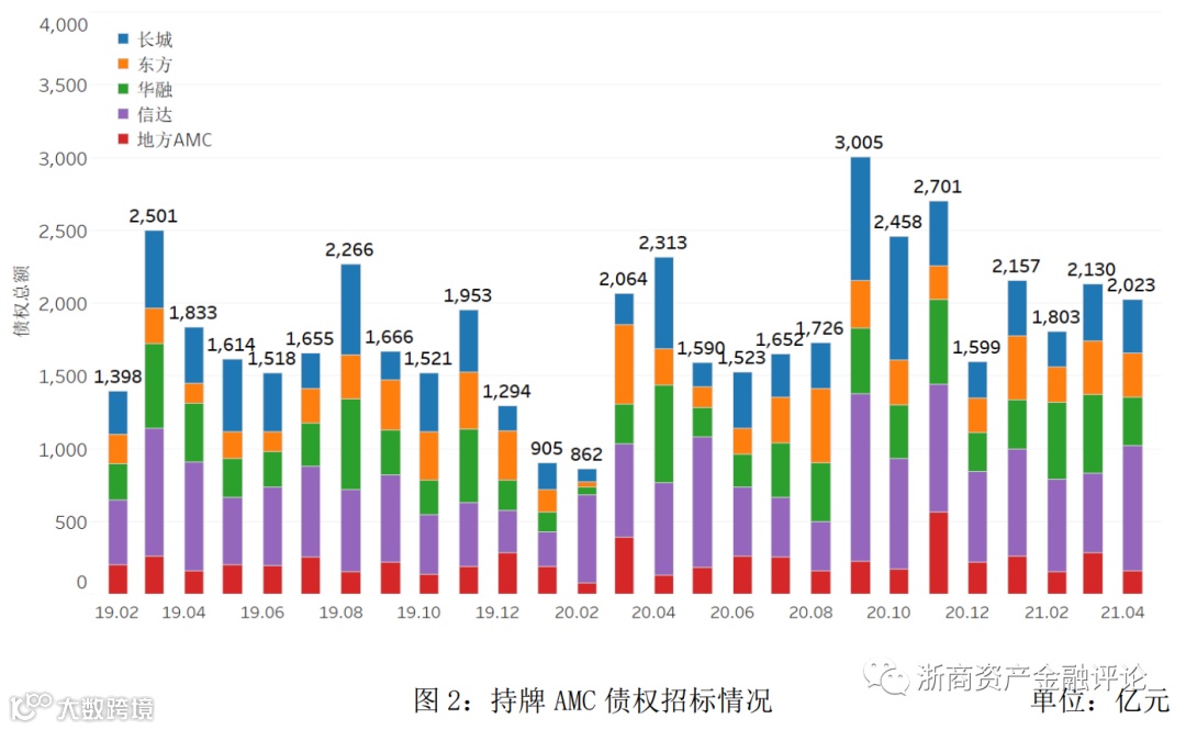 从持牌AMC的招标情况来看,2021年4月招标规模相比于2020年4月有所下降,招标规模约为2,023亿元。其中,信达招标占比42.4%,华融招标占比16.6%,长城招标占比18.3%,东方招标占比14.8%,地方AMC招标合计占比7.9%。除华融、长城外,其他持牌机构的招标规模同比上升。其中信达招标规模同比上升最多,约为35.7%。