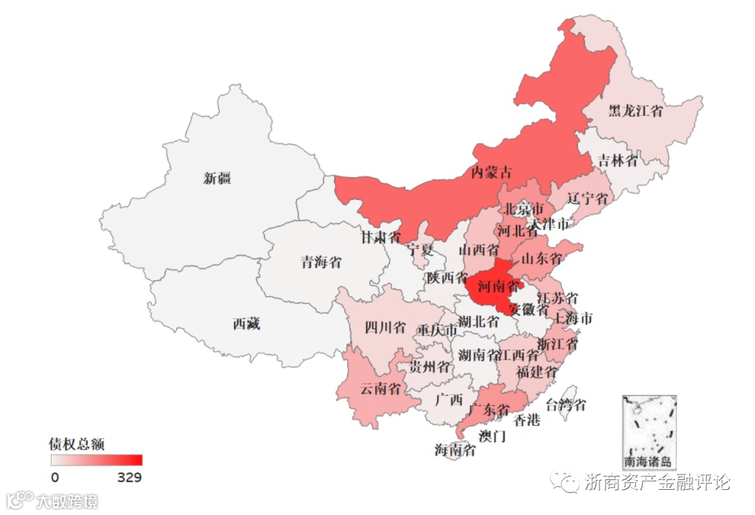 2、从全国的区域市场情况来看,在AMC债权招标方面,河南省规模约为329亿元,占比16.3%,内蒙古规模约为241亿元,占比11.9%,河北省规模约为169亿元,占比8.4%。在银行债权成交方面,山东省规模约为31亿元,占比21.8%,浙江省规模约为20亿元,占比14.1%,四川省省规模约为18亿元,占比12.7%;在AMC债权成交方面,浙江省规模约为45亿元,占比33.3%,山东省规模约为34亿元,占比25.2%,江苏省规模约为14亿元,占比10.4%。