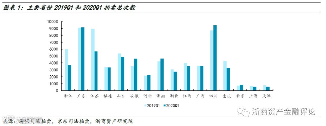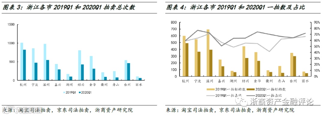 2020年一季度淘宝和京东浙江司法拍卖房产共计3,683次,同比下降39%。分地级市来看,浙江省11市2020年一季度司法拍卖房产总次数均同比下降。2020年一季度淘宝和京东浙江司法拍卖房产中一拍房产共计2,431次,同比下降33%;一拍房产数占总拍卖房产次数的比重为66%,同比上升6个百分点。分地级市来看,浙江省全部11市2020年一季度司法拍卖一拍房产数同比均下降。除嘉兴之外,其余10市2020年一季度司法拍卖一拍房产占比同比均上升。