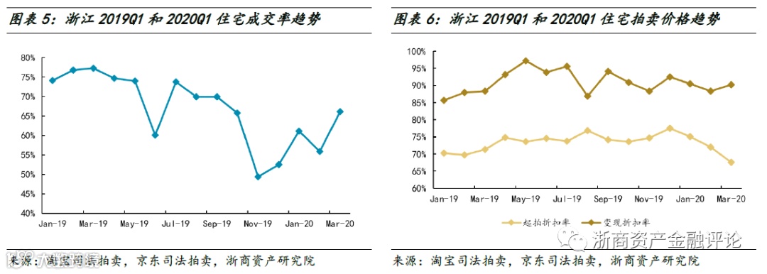 在成交率方面,2020年一季度浙江住宅成交率呈现上升趋势,整体水平却明显低于2019年一季度。在拍卖价格方面,2020年一季度浙江住宅变现折扣率总体保持稳定,整体水平要略高于2019年一季度,同时,变现价相对于起拍价的溢价幅度呈扩大的趋势。