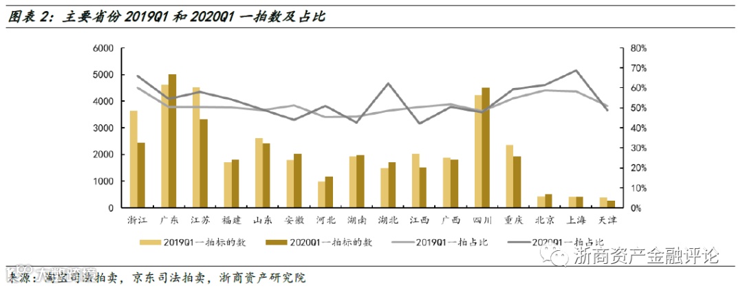 一拍环节的房产数量变化代表了网络拍卖房产市场规模的实际变化情况,其相对整个拍卖房产次数的比重则反映了网络拍卖房产市场的一拍成交率,也就是网络拍卖房产市场的流动性。因此,2020年一季度全国淘宝和京东司法拍卖市场规模小幅扩大,市场流动性也小幅上升。分省来看,浙江、江苏、山东、江西、广西、重庆、上海、天津8省市2020年一季度淘宝和京东司法拍卖市场规模缩小,其余8省市2020年一季度淘宝和京东司法拍卖市场规模扩大;除山东、安徽、湖南、江西、广西、四川、天津7省市外,其余9省市2020年一季度淘宝和京东司法拍卖市场流动性均有不同程度的改善。16省市中,四川、广东、江苏市场规模最大,上海、浙江、湖北的市场流动性最好。