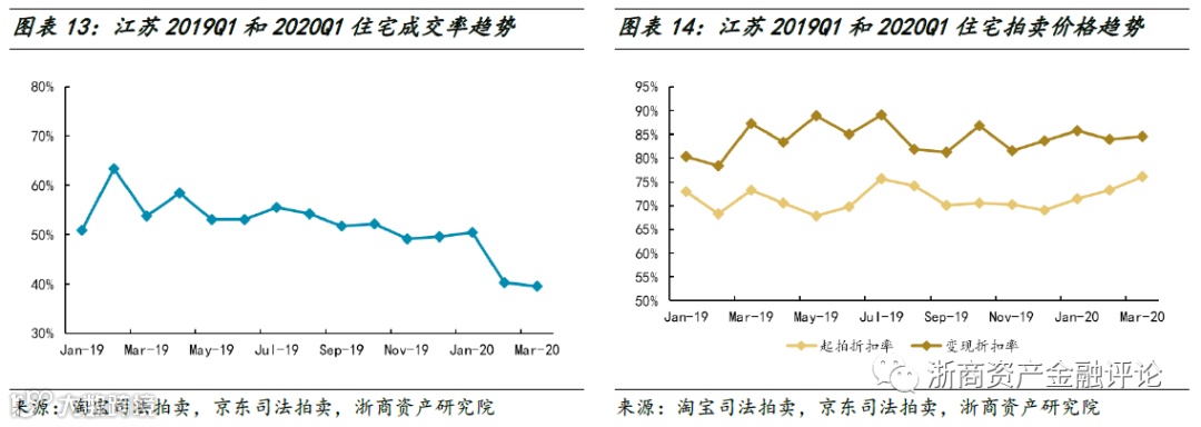 在成交率方面,2020年一季度江苏住宅成交率有所下降,整体水平明显低于2019年一季度。在拍卖价格方面,2020年一季度江苏住宅变现折扣率保持稳定,整体水平高于2019年一季度,变现价相对于起拍价的溢价幅度相比于2019年一季度收窄。
