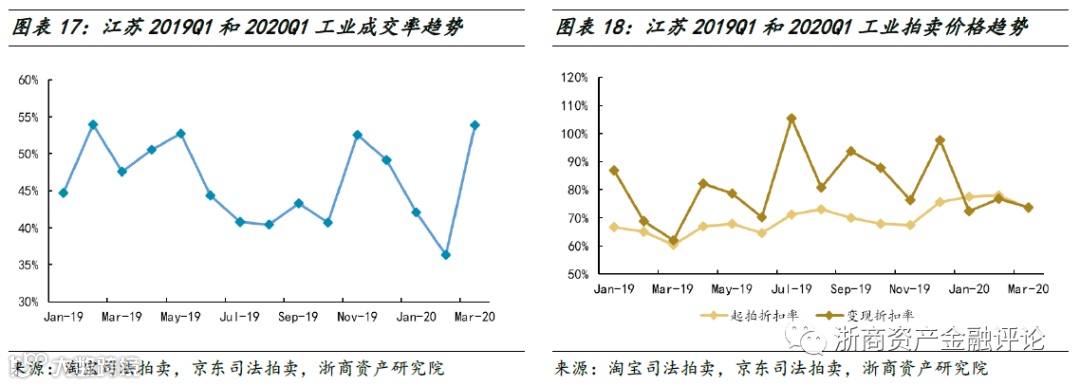 在成交率方面,2020年一季度江苏工业成交率先降后升,但整体水平低于2019年一季度。在拍卖价格方面,2020年一季度江苏工业变现折扣率保持稳定,整体水平略低于2019年一季度,同时变现价相对于起拍价的溢价幅度收窄,出现倒挂现象。