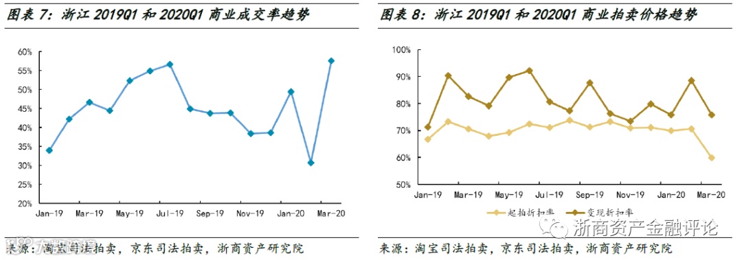 在成交率方面,2020年一季度浙江商业成交率波动较大,但是整体水平与2019年一季度相近。在拍卖价格方面,2020年一季度浙江商业变现折扣率波动幅度较大,整体水平与2019年一季度相近,且变现价相对于起拍价的溢价幅度与2019年一季度也十分相近。