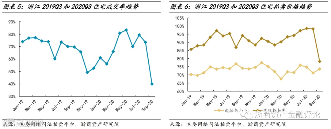 在成交率方面,2020年三季度浙江住宅成交率呈现下降趋势,整体水平高于2019年三季度。在拍卖价格方面,2020年三季度浙江住宅变现折扣率总体保持稳定,整体水平要高于2019年三季度,同时,变现价相对于起拍价的溢价幅度呈扩大的趋势。
