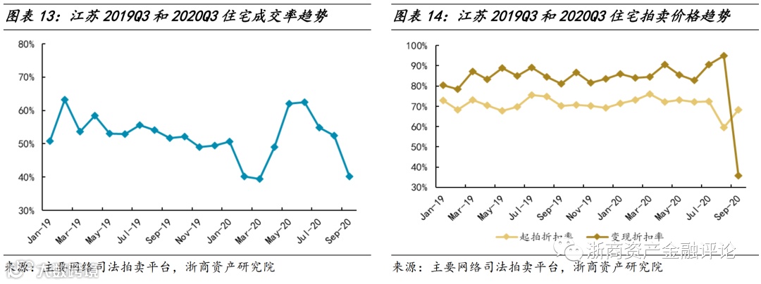 在成交率方面,2020年三季度江苏商业成交率保持平稳,整体水平与2019年三季度持平。在拍卖价格方面,2020年三季度江苏商业变现折扣率大幅提升,整体水平高于2019年三季度,变现价相对于起拍价的溢价幅度与前两个季度相比明显扩大。
