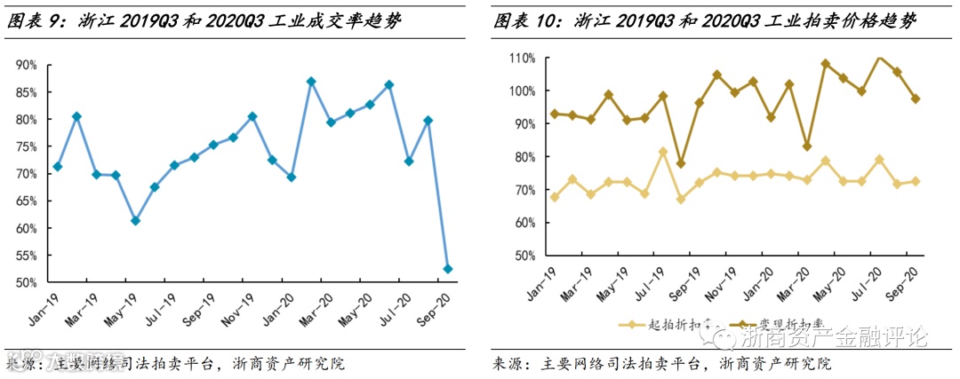 在成交率方面,2020年三季度浙江工业成交率先升后降,整体水平低于2019年三季度。在拍卖价格方面,2020年三季度浙江工业变现折扣率呈现下降趋势,整体水平略高于2019年三季度,变现价相对于起拍价的溢价幅度有所扩大。