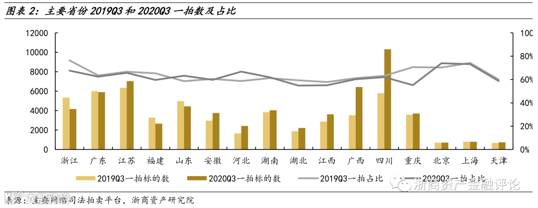 一拍环节的房产数量变化代表了网络拍卖房产市场规模的实际变化情况,其相对整个拍卖房产次数的比重则反映了网络拍卖房产市场的流动性。因此,2020年三季度全国司法拍卖市场规模扩大,市场流动性小幅下降。分省来看,浙江、广东、福建、山东4省市2020年三季度司法拍卖市场规模缩小,其余12省市2020年三季度司法拍卖市场规模扩大;16个省市中只有山东、河北、湖南、北京2020年三季度司法拍卖市场流动性均有不同程度的改善。16省市中,四川、广东、江苏、广西市场规模最大,北京、上海、浙江的市场流动性最好。