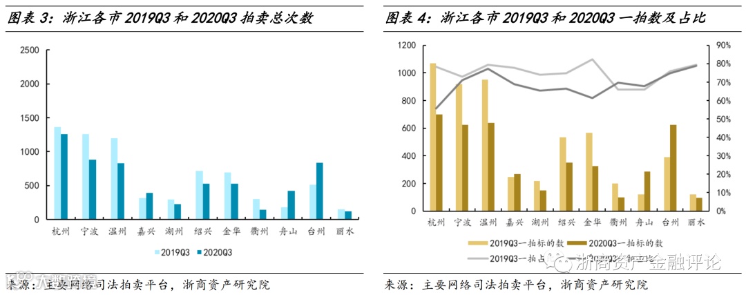 2020年三季度浙江司法拍卖房产共计6154次,同比下降12%。分地级市来看,除嘉兴、舟山、台州外,浙江省其他8市2020年三季度司法拍卖房产总次数均同比下降。2020年三季度浙江司法拍卖房产中一拍房产共计4158次,同比下降22%;一拍房产数占总拍卖房产次数的比重为68%,同比下降9个百分点。分地级市来看,除嘉兴、舟山、台州外,其他8市2020年三季度司法拍卖一拍房产数同比均下降。除衢州、舟山之外,其余9市2020年三季度司法拍卖一拍房产占比同比均下降。