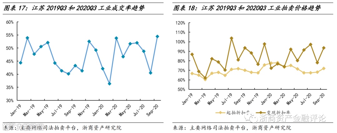 在成交率方面,2020年三季度江苏工业成交率先降后升,但整体水平略高于2019年三季度。在拍卖价格方面,2020年三季度江苏工业变现折扣率保持正常波动,整体水平与2019年三季度持平,同时变现价相对于起拍价的溢价幅度收窄。