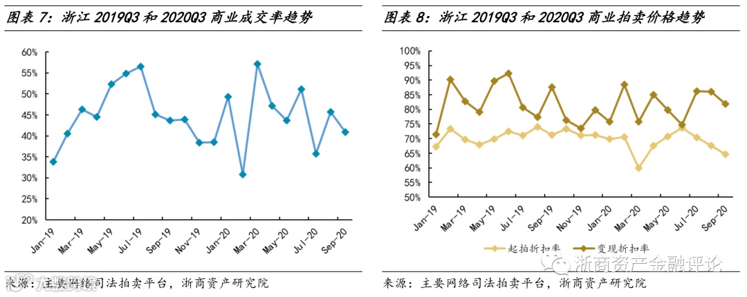 在成交率方面,2020年三季度浙江商业成交率大幅攀升,整体水平高于2019年三季度。在拍卖价格方面,2020年三季度浙江商业变现折扣率波动幅度较小,整体水平与2019年三季度相近,且变现价相对于起拍价的溢价幅度比2019年三季度有所扩大。
