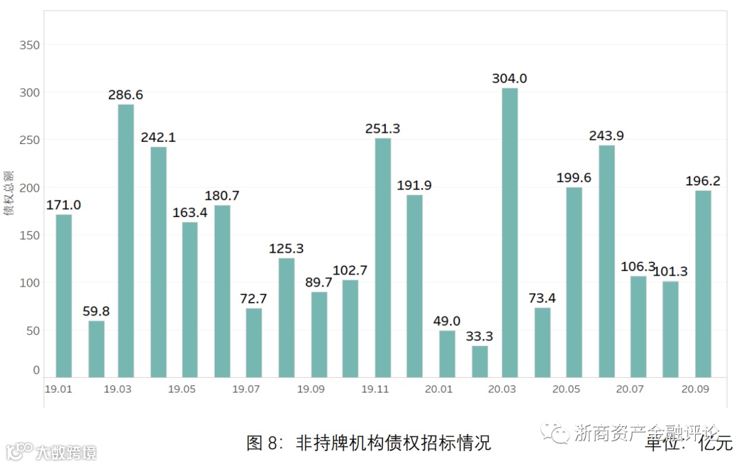 1、从债权市场的整体情况来看,2020年三季度银行招标规模约为343亿元,同比下降5.0%,AMC招标规模约为6,347亿元,同比上升13.8%,非持牌机构招标规模约为404亿元,同比上升40.3%;银行成交规模约为946亿元,同比下降13.5%,AMC成交规模约为638亿元,同比下降22.4%,非持牌机构成交规模约为233亿元,同比下降18.5%。2020年三季度债权市场的招标规模先降后升,总体同比上升;成交规模保持稳定,九月底有下降趋势,与去年同期相比有所下降,由此可见,三季度受银行债权包价格上升的影响,一级市场和二级市场的债权成交规模都受到一定的影响。